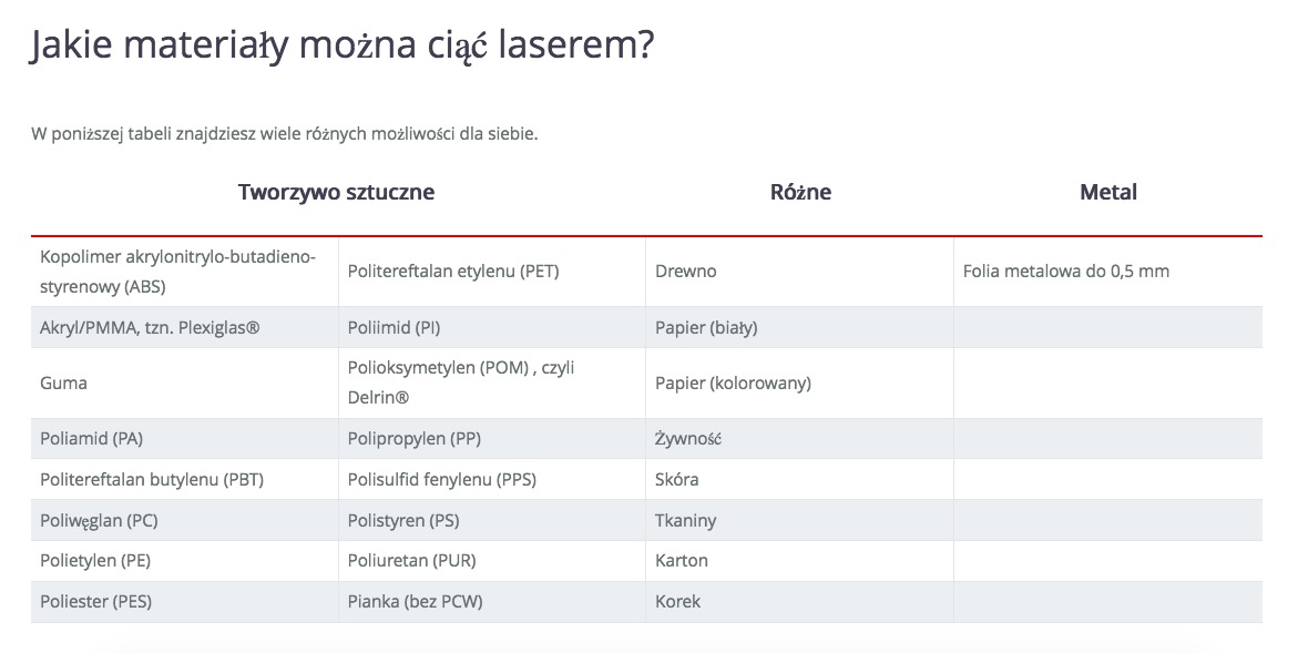 Cięcie laserem CO2 Oferujemy usługę wycinania laserem CO2 materiałów takich jak plexi, sklejka, karton, papier, polipropylen. Posiadamy dwa plotery laserowe o polu roboczym 160x100 cm + możliwość włożenia dłuższego materiału i 45x28 cm.
