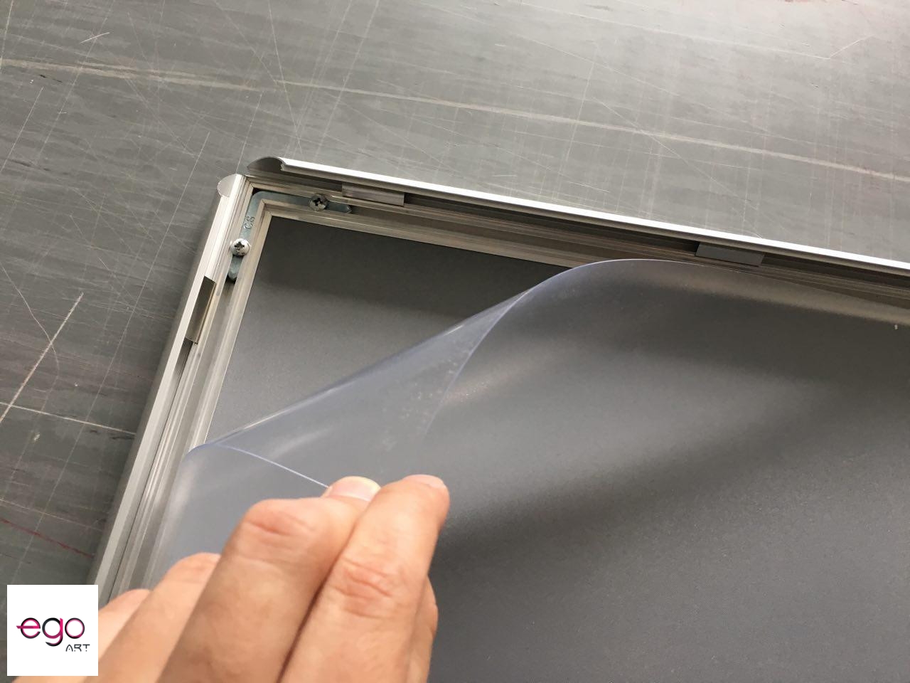 Grafikę wymienia się bez sciągania ramki. Podnosi się do góry cztery elementy, z których składa się ramka, wyciąga grafikę, wkłada nową grafikę i zamyka. Gotowe!
