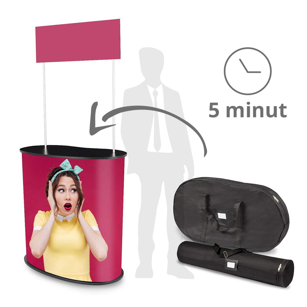 Stoisko promocyjne - niezastąpione podczas promocji, degustacji czy prezentacji. Błyskawicznie składana konstrukcja na sztywny rzep pozwala szybko zmontować nasze nowe stoisko. W zestawie 2 blaty z płyty MDF w kolorze czarnym (góra + dół), panel z komorowego PCV z grafiką oraz topper górny z 2 masztami aluminiowymi.