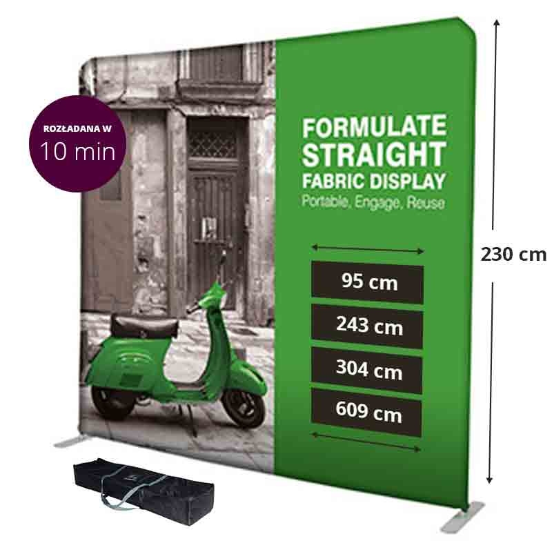 Ścianka tekstylna (materiałowa) Formulate jest systemem umożliwiającym stworzenie spektakularnej, rozległej ekspozycji graficznej. Pełnokolorowy dowolny wydruk na tkaninie pozwala na uzyskanie dowolnej ekspozycji graficznej na targi, konferencję do wnętrz jako elementy informacyjne lub promocyjne. Elementy wykonane są z aluminium, a ich montaż jest niezwykle prosty. System pozwala na przedstawienie grafiki z tkaniny, którą naciąga się na ramy. System Ścianki tekstylnej Formulate Prosty dostępny jest w 4 wymiarach od 95 do 609 cm szerokości. Każdy o wysokości 228 cm.